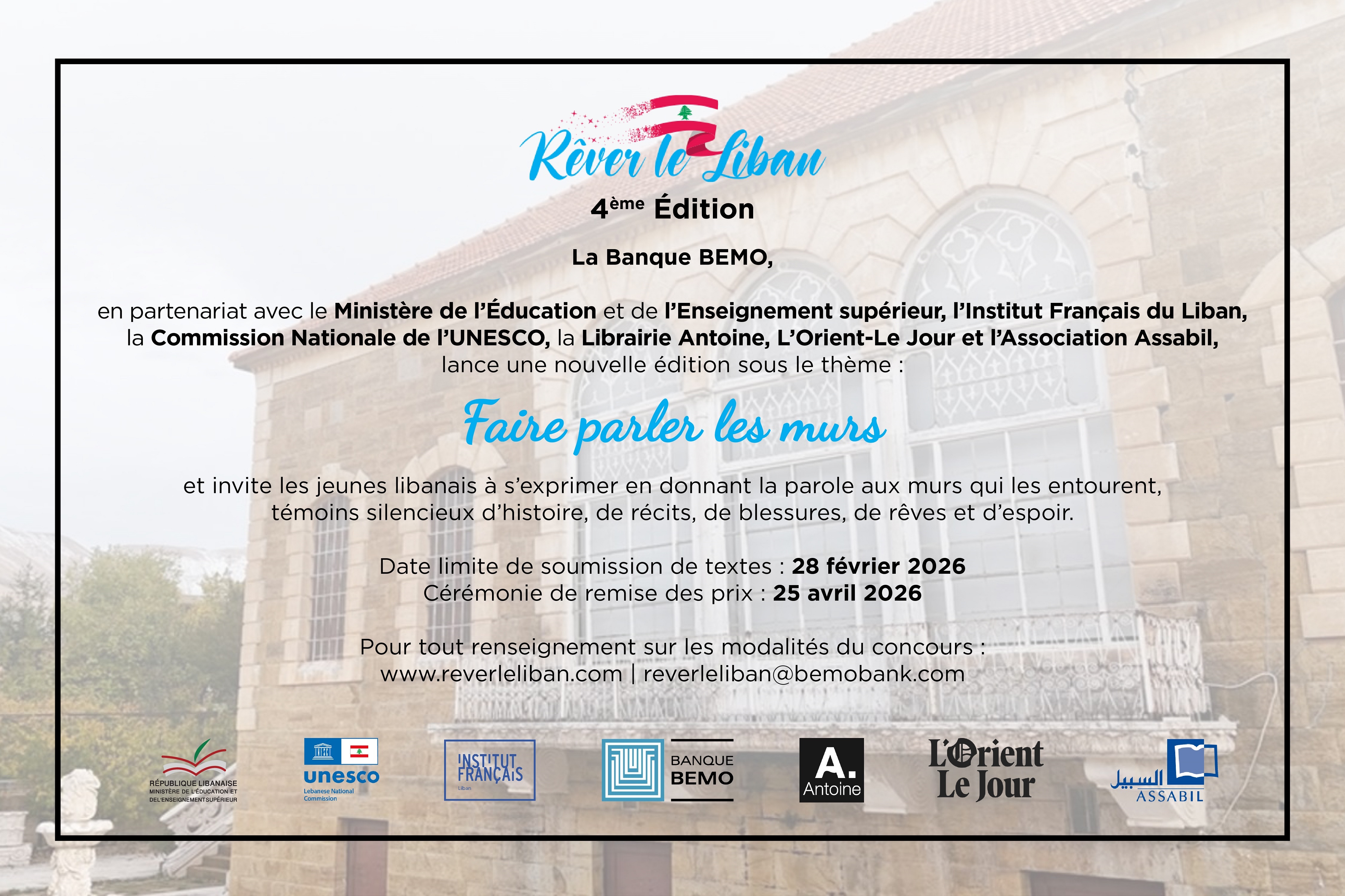 En créant ce concours de nouvelles, Riad Obeji, PDG de la Banque Bemo, souhaitait projeter les jeunes Libanais vers leur avenir, mais aussi les enraciner dans leur pays en les emmenant, édition après édition, à la découverte de nos trésors cachés. Avec cette quatrième édition nous souhaitions faire découvrir à nos jeunes, leur patrimoine régional comme le patrimoine national souvent mieux connu. Nous avions dans l’idée que nos jeunes aillent à la découverte de ces ruines romaines, phéniciennes, croisées ou omeyades devant lesquelles ils passent sans les voir… Qu’ils fassent parler les murs de l’église ou de la mosquée de leur village, ceux du vieux café où se retrouvent les anciens qui se souviennent de leurs pères qui s’asseyaient à ces mêmes tables bancales… ou encore les murs du vieux pressoir du village qui continuent à presser les olives cueillies par les jeunes d’aujourd’hui avec les mêmes gestes que ceux qui ont planté ces oliviers.